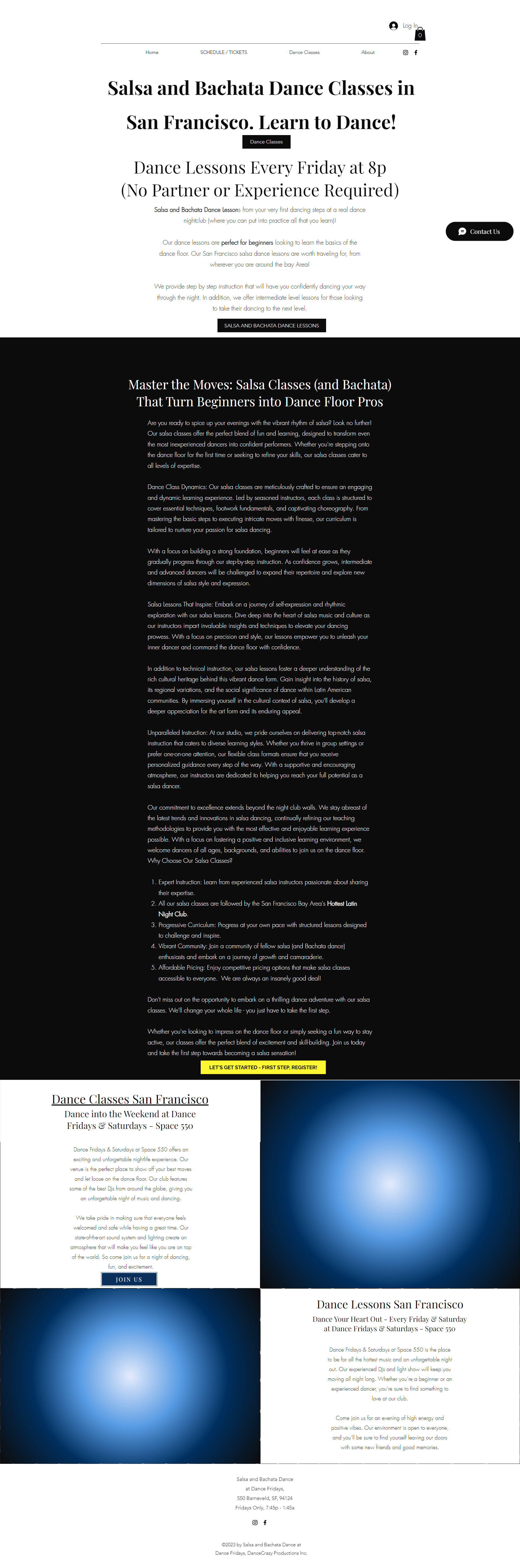 San Francisco's Premiere Salsa and Bachata Dance Latin Night ClubDance Fridays is the largest and longest running Salsa and Bachata Dance club in the San Francisco Bay Area.Since 2015, Dance Fridays has been entertaining the San Francisco area with salsa and bachata dancing, live, and must-dance shows. After the close of Cafe Cocomo in San Francisco, the bay area longed for a large dance club, with a big stage, multiple rooms, great sounds system, and a big "copa" like feel.Dance Fridays opened in February of 2015, Valentines Weekend, with Avance live on Stage.Every week, we feature the best dancers, fantastic music, strong drinks and great atmosphere — don’t look anywhere else for a night out on the town. We’re open every Friday (and very rare Saturdays).We'd also love to host your birthdays and private parties.Get in touch for more information.Salsa and Bachata at Dance Fridays is located at 550 Barneveld Ave, SF, 94124.Dance Lessons are for everyone, and beginner Friendly, every Friday at 8p.